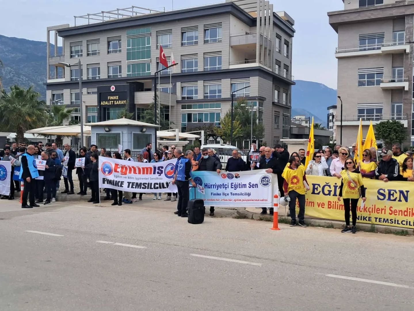 Finike’de faaliyet gösteren Eğitim-İş, Eğitim-Sen, Türk Eğitim-Sen ve Hürriyetçi Eğitim-Sen üyeleri, yaşanan şiddet olaylarını protesto etmek amacıyla bugün iş bırakma eylemi gerçekleştirerek Hükümet Konağı önünde bir araya geldi.