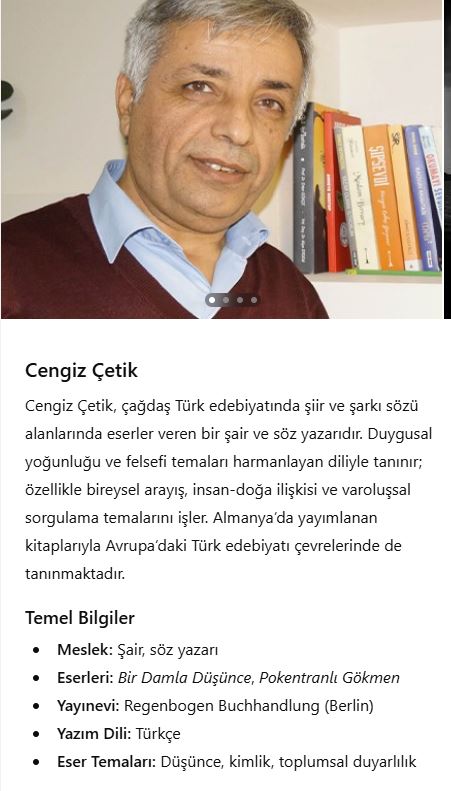 Berlin merkezli yayımlanan kitapları, Avrupa’daki Türk diasporasının kültürel üretimi içinde özel bir yere sahiptir. Çetik’in şiirleri, iki kültür arasında kalan bireyin kimlik ve aidiyet arayışını yansıtır. Bu özellikleriyle hem Türkçe edebiyat okurları hem de göç edebiyatı araştırmacıları için dikkat çekicidir.
