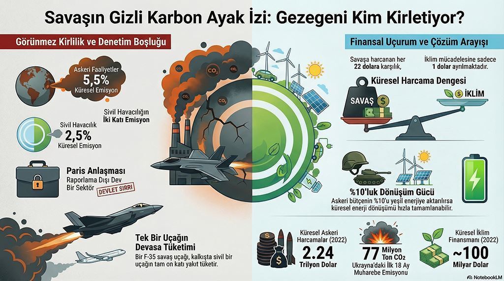 Uzmanlara göre askeri faaliyetlerin barış zamanındaki emisyonları küresel sera gazı salımının yaklaşık yüzde 5,5’ini oluşturuyor. Bu oran, sivil havacılık sektörünün karbon ayak izinin yaklaşık iki katına denk geliyor.