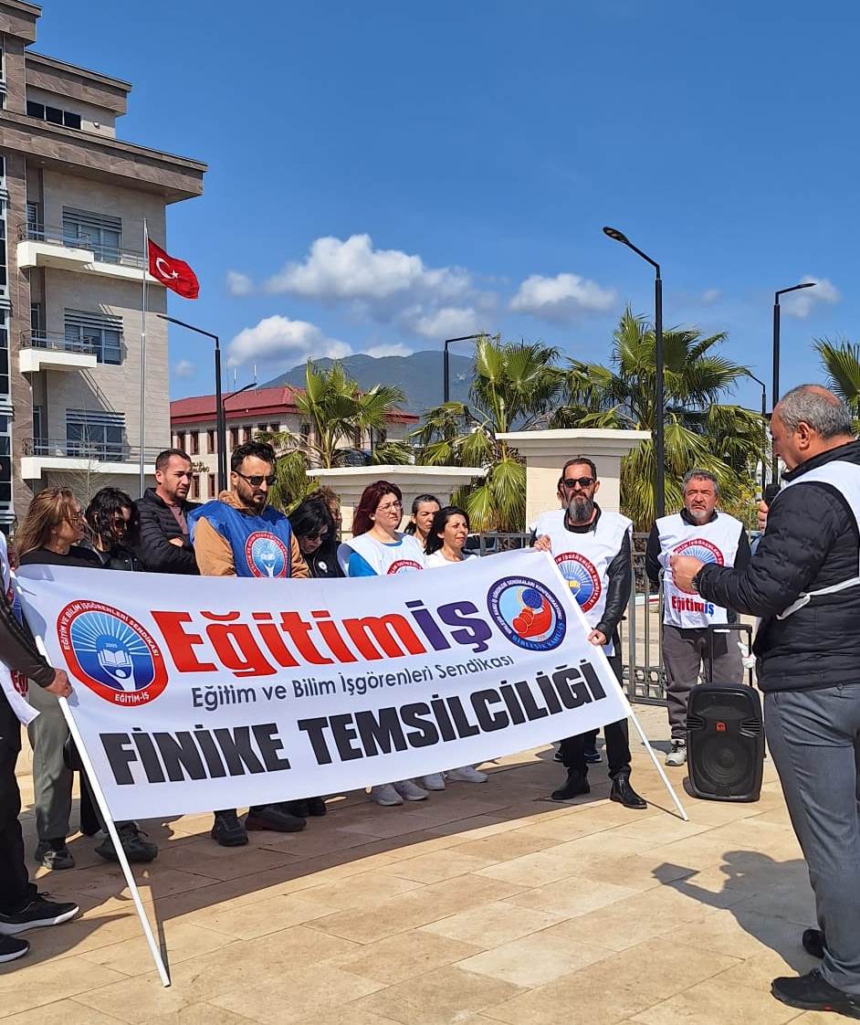 Eğitim-İş üyeleri, saat 14.00’te Finike İlçe Milli Eğitim Müdürlüğü önünde (Hükümet Konağı) bir araya gelerek basın açıklaması yaptı.