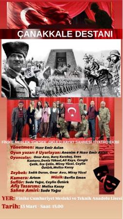 SEÇKİNHABERTV- (Haber: Cengiz Çetik/Finike)-Gençler Çanakkale ruhunu sahneye taşıyor. Finike MYO Hayat Sahnesi Tiyatro Ekibi, “Çanakkale Destanı” ile iki ayrı gösterimde izleyici karşısına çıkacak.