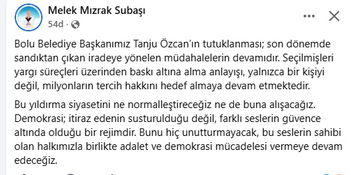 “ Bolu Belediye Başkanımız Tanju Özcan’ın tutuklanması; son dönemde sandıktan çıkan iradeye yönelen müdahalelerin devamıdır. Seçilmişleri yargı süreçleri üzerinden baskı altına alma anlayışı yalnızca bir kişiyi değil, milyonların tercih hakkını hedef almaktadır.”