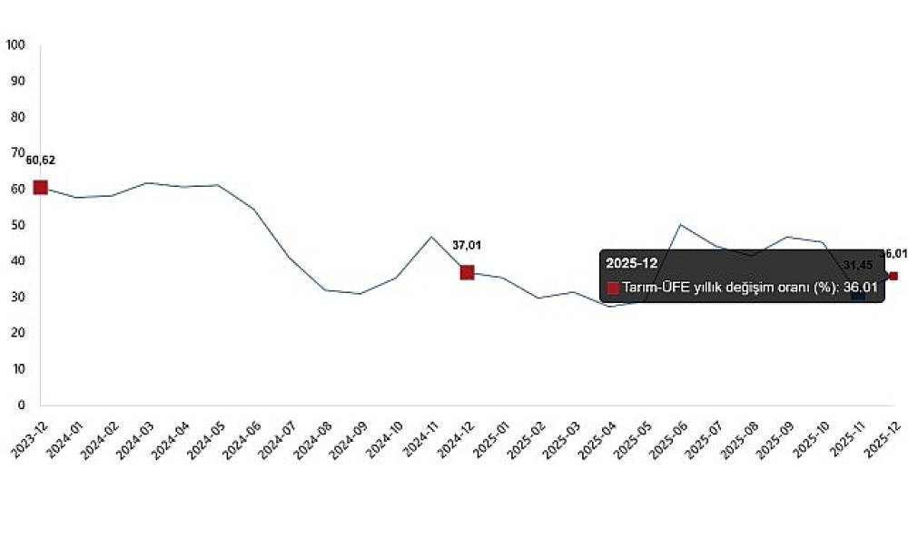 Tarım-ÜFE'de (2020=100), 2025 yılı Aralık ayında bir önceki aya göre %3,06 artış, bir önceki yılın Aralık ayına göre %36,01 artış, bir önceki yılın aynı ayına göre %36,01 artış ve on iki aylık ortalamalara göre %37,47 artış gerçekleşti.